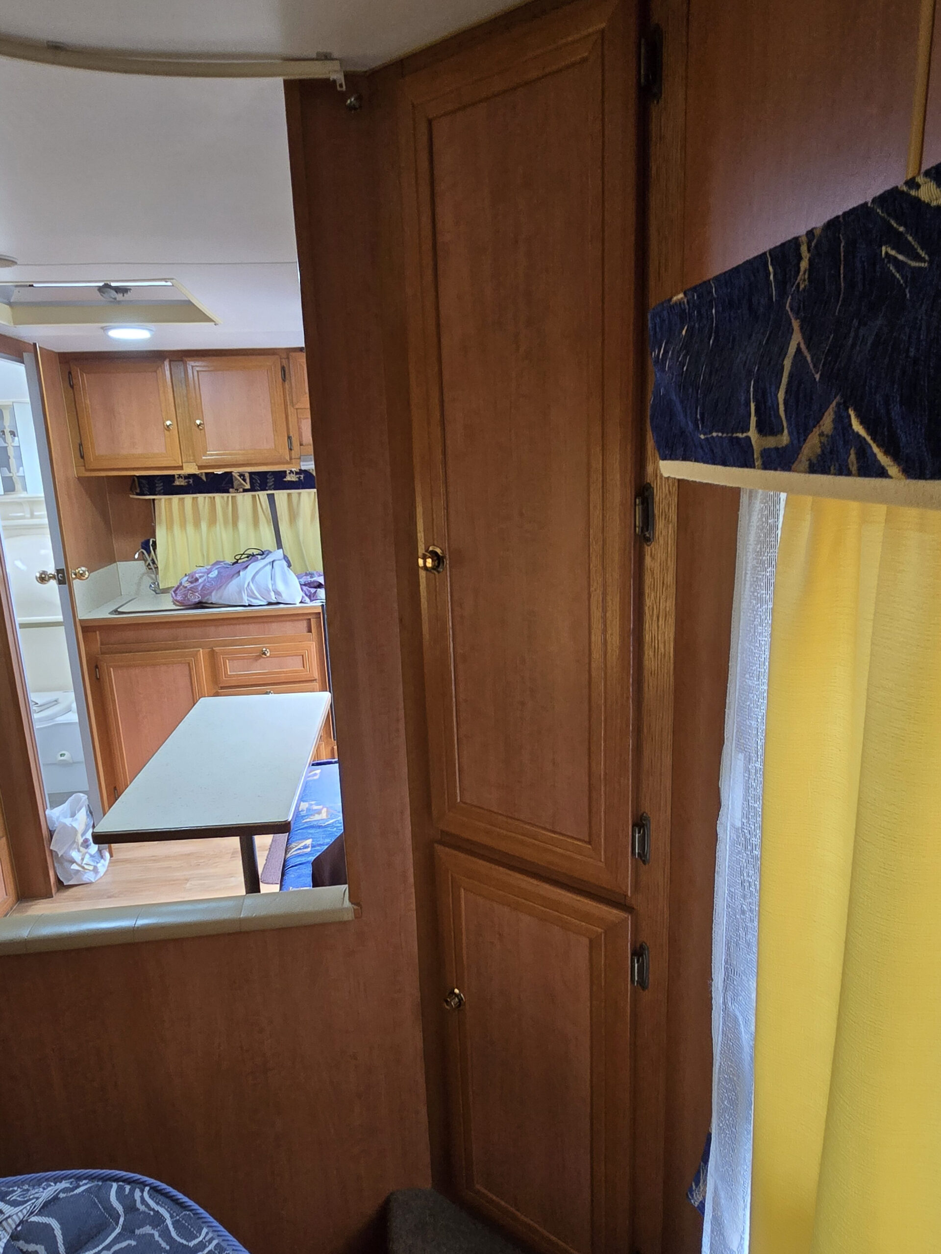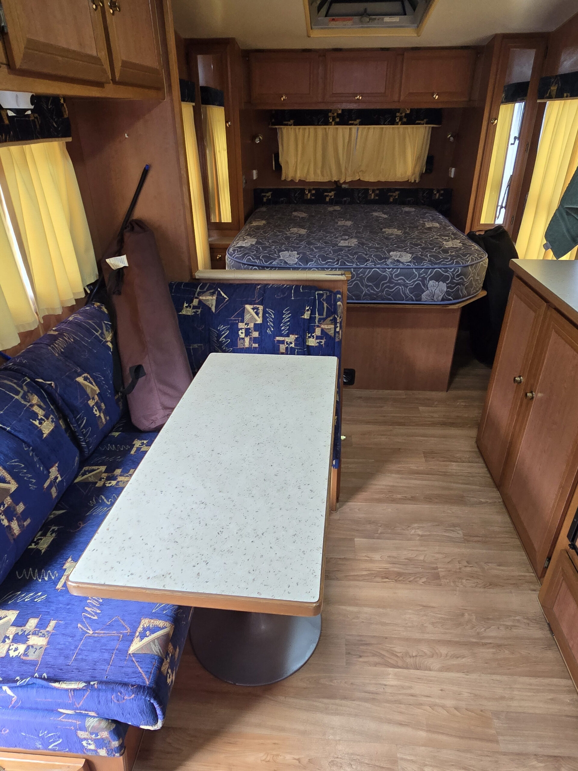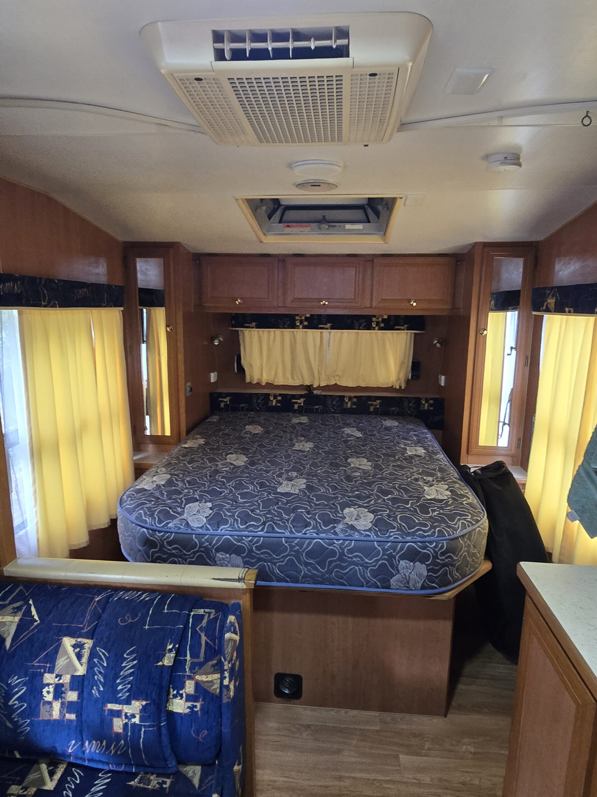 • Queen innerspring mattress (north/south); hydraulic under-bed storage & small safe