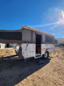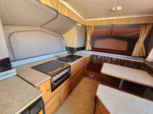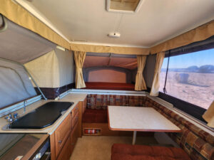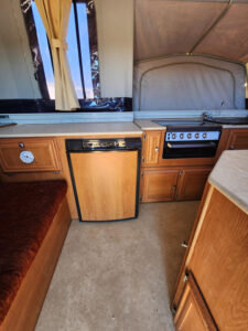 Very good used condition – clean, tidy and ready to hit the road. Spacious and practical, folds down for easy towing and opens up to a roomy and funtional loving space. Sleeps 5 comfortable, solar panel set up, 3 way fridge, external anderson plugs