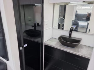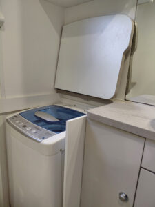 Ensuite with top load washing machine, Dometic Toilet Cassette, Ceramic toilet & vanity basin. Fibreglass shower cubicle, Mixer taps in basin, sink & shower, timber sliding privacy door.