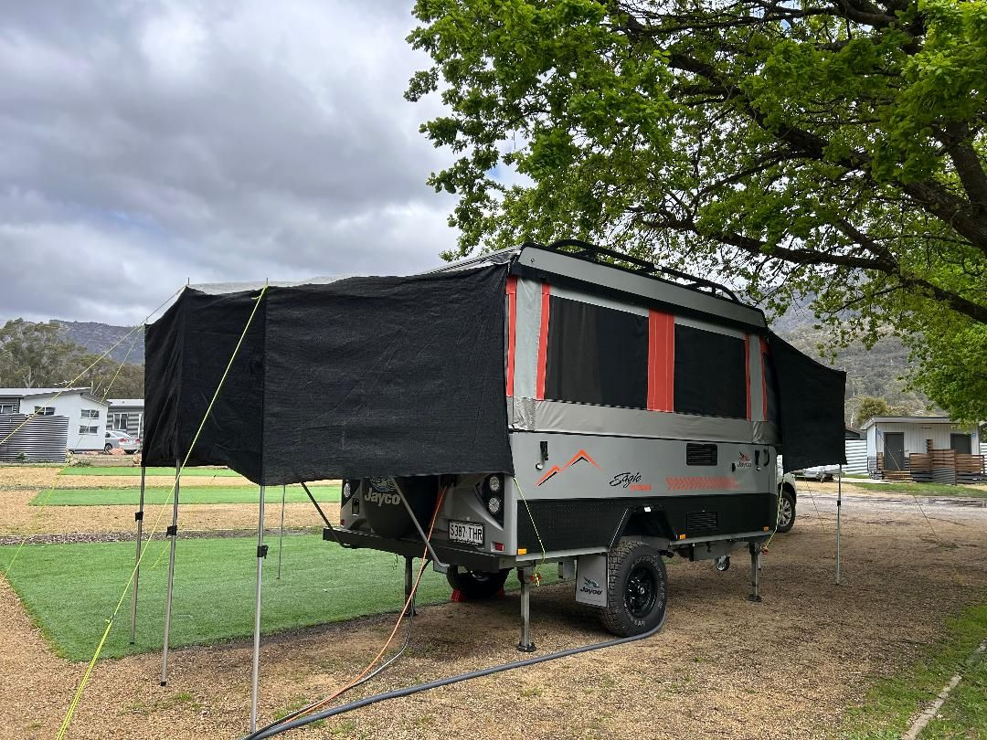 This is a camper trailer designed for off-road capability with independent suspension and a durable outback build.