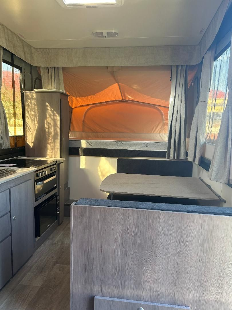 It includes a 80L water tank, a 3-way fridge, a 4-burner cooktop, grill and a sink. It also has internal and external T.V outlets.