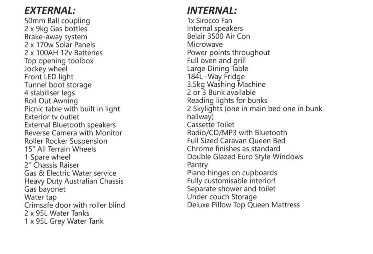 Please see attached photo for full interior & exterior inclusions – in addition to this, the caravan also includes: