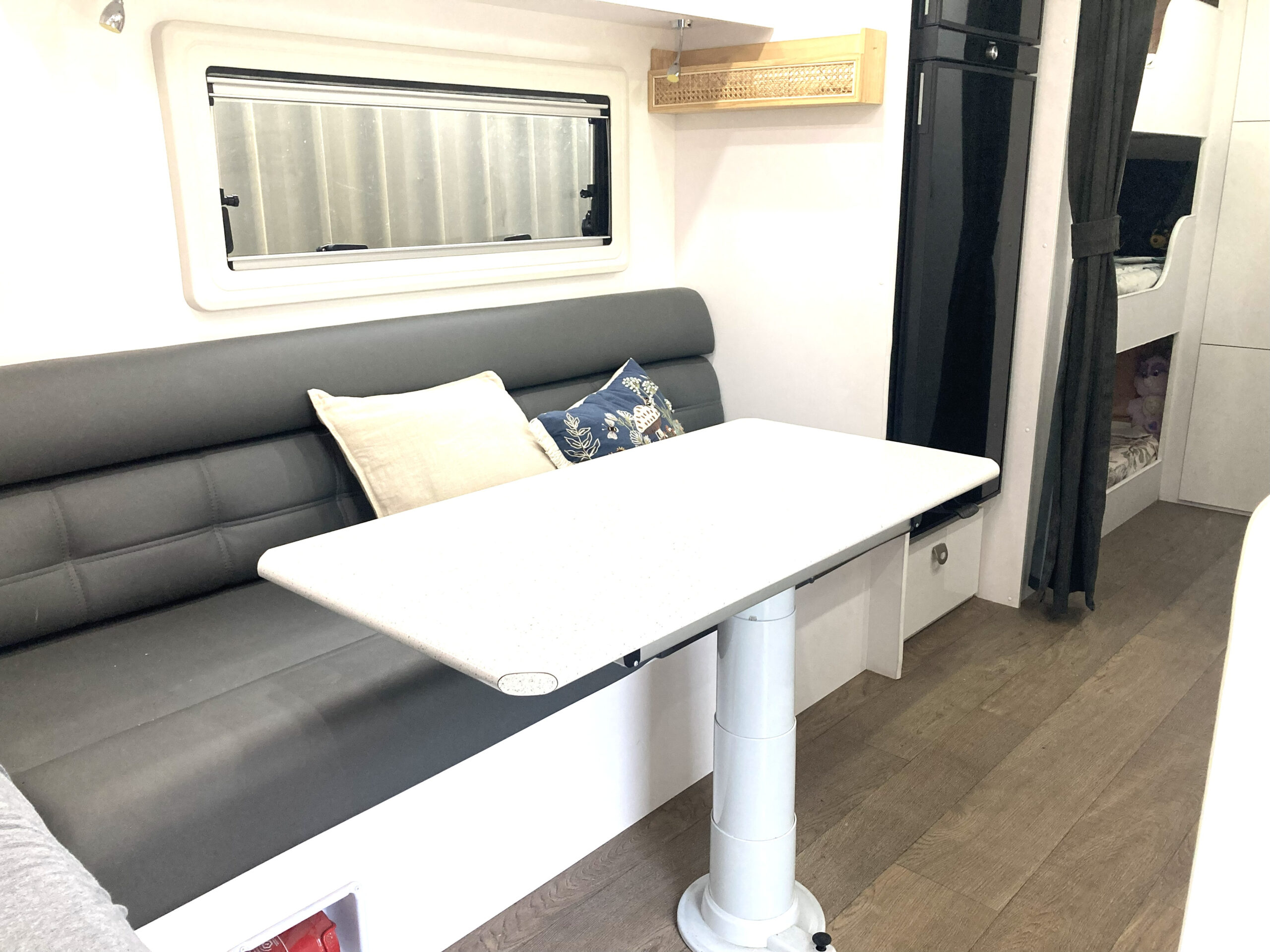 · Telescopic/adjustable dining table (can transform to an additional bed), and moves around to make space.
