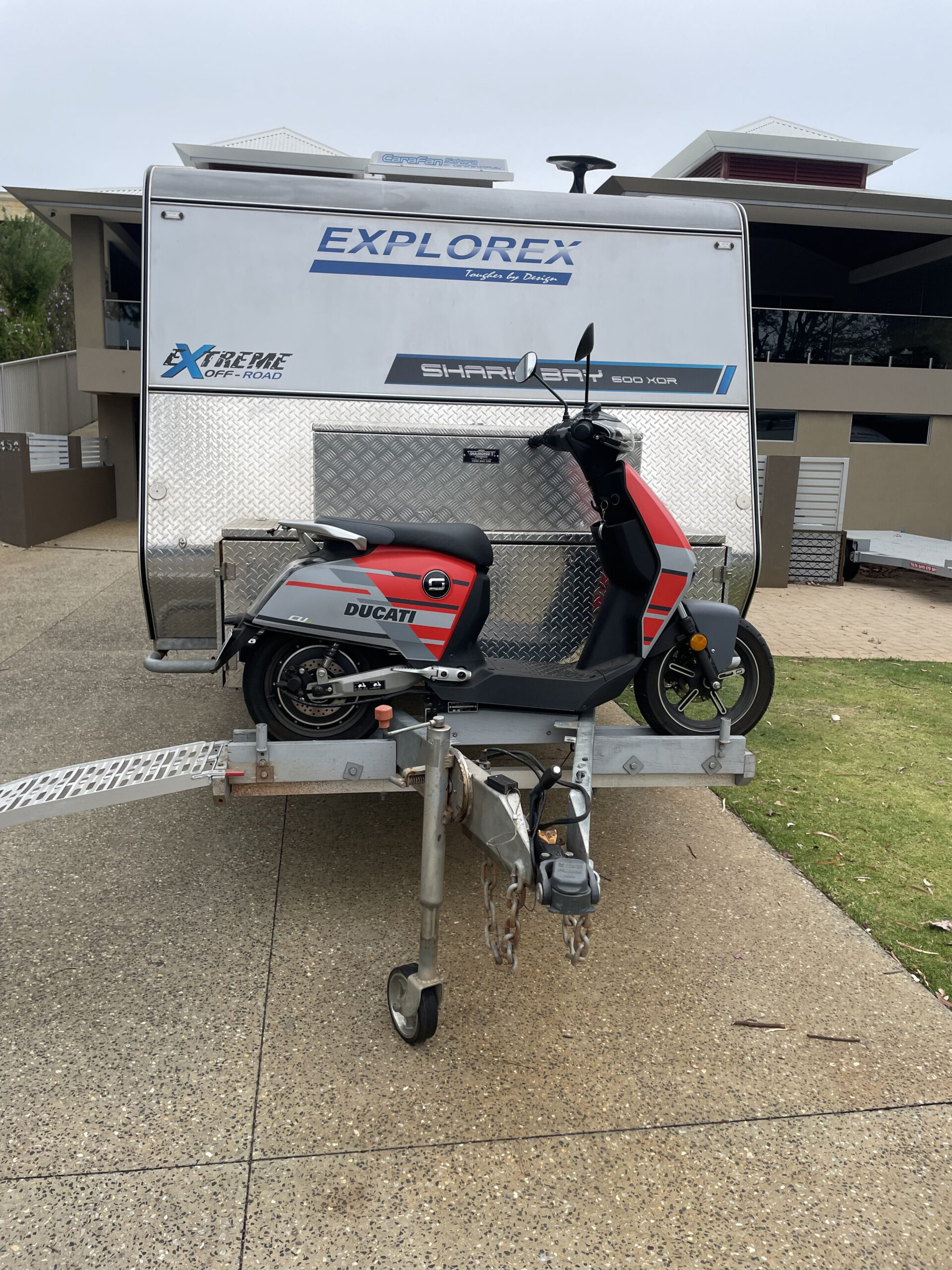 With electric scooter mounted on front with ramp licensed for road and drive on car license.
