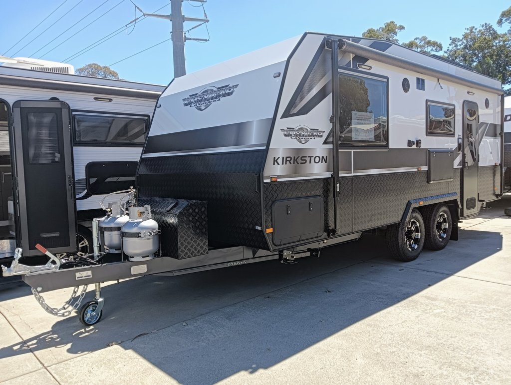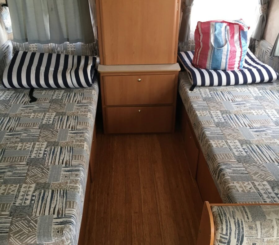Inside kitchen with 3 way fridge, oven, grill and microwave