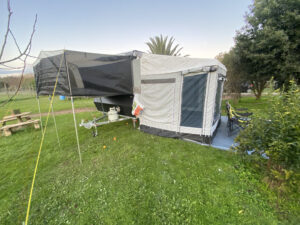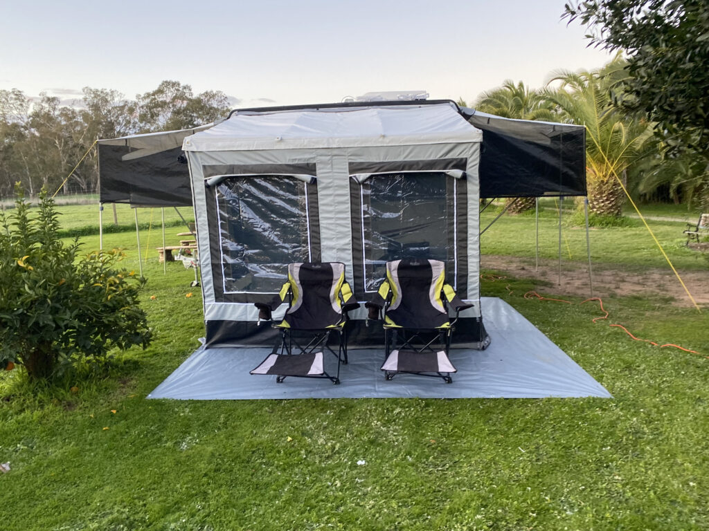 Dual batteries, Inverter, TV includes built-in DVD player.