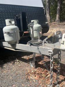 Slide out external hooded gas BBQ.